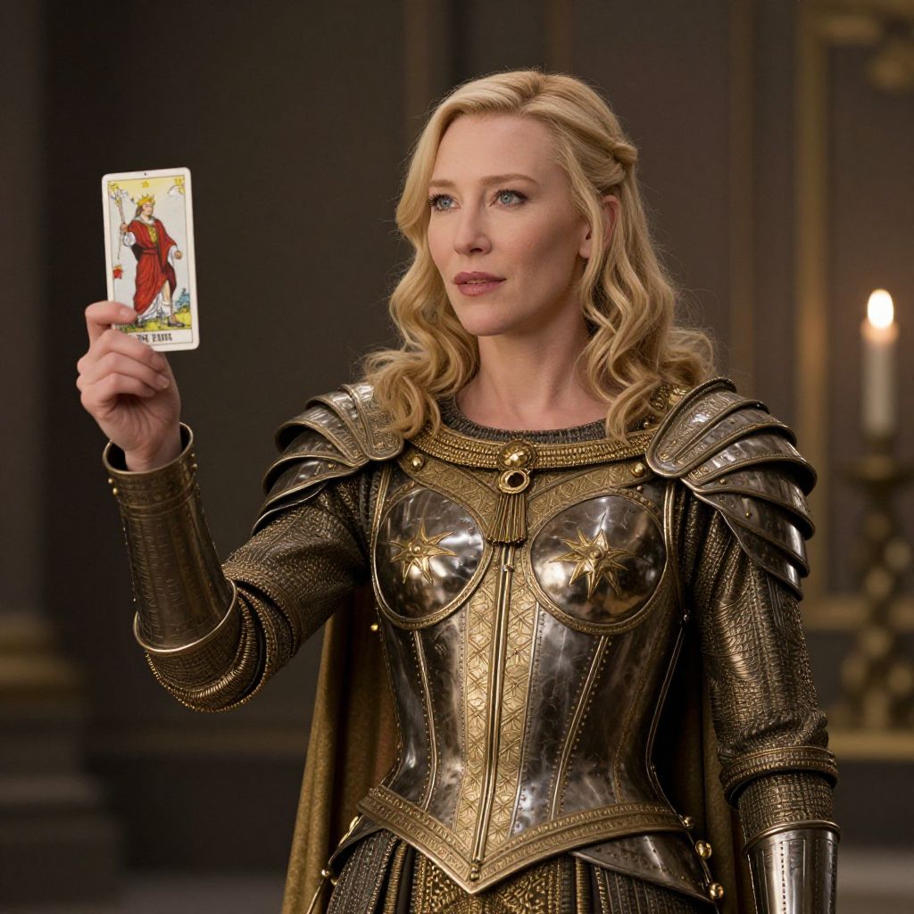 An artistic portrayal of a woman channeling the authority of the Tarot card 'The Emperor', clad in ornate armored attire that echoes the regal aesthetic of Cate Blanchett's performances.