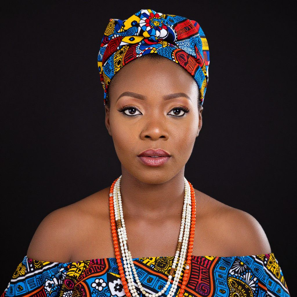 African Traditional Outfit Woman Costume, a close up of a woman with a colorful head dress and a necklace