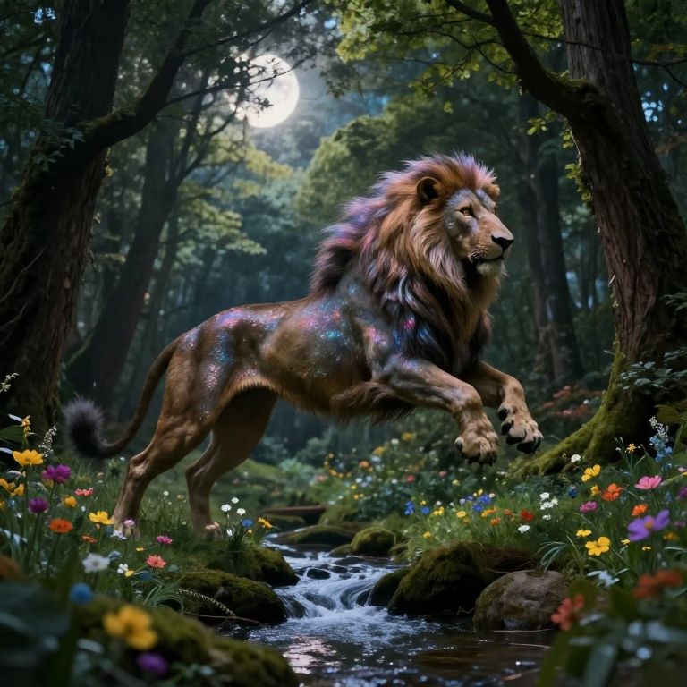 Digital artwork of a shimmering, mythical lion with a rainbow mane leaping over a forest stream, surrounded by colorful wildflowers under a moonlit night