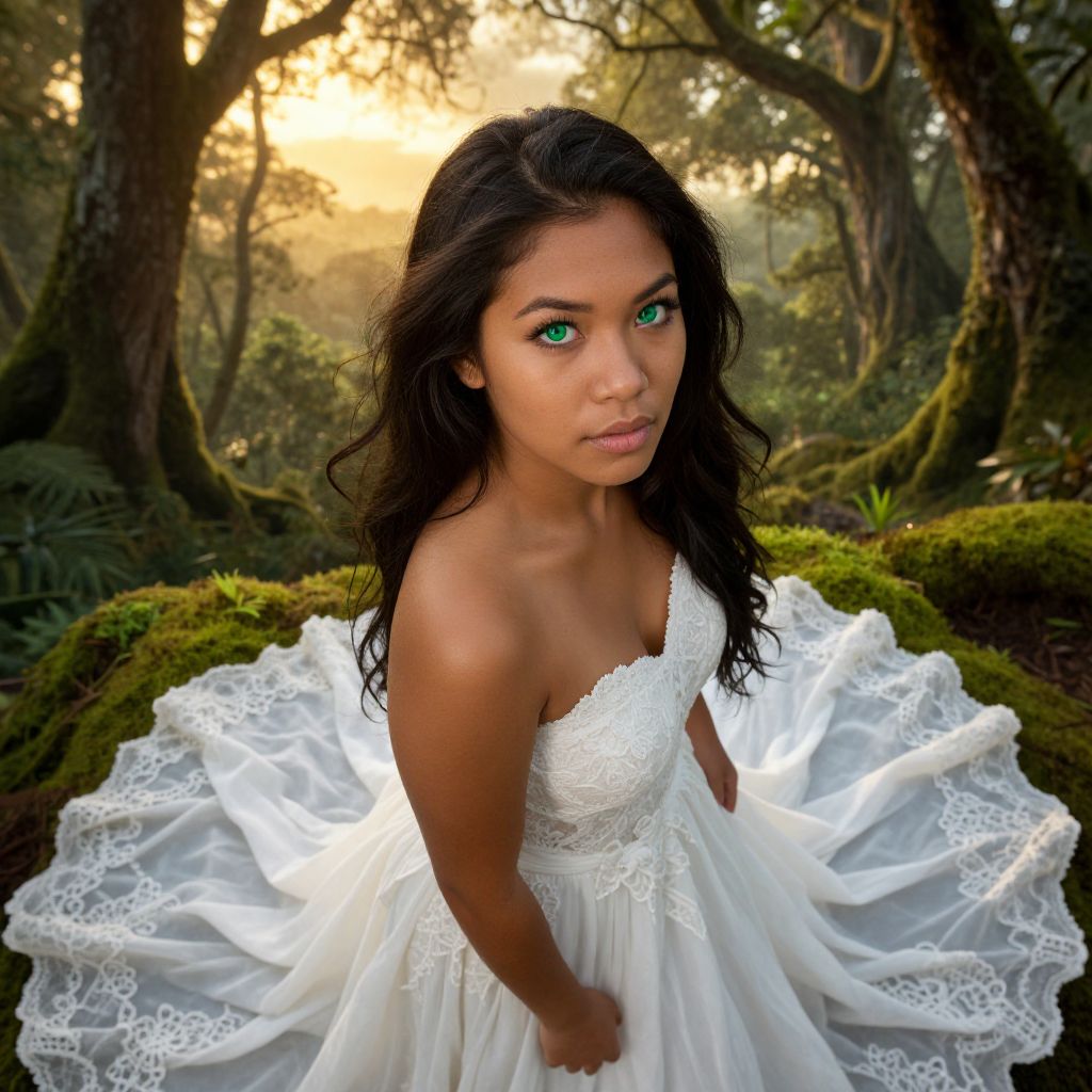 Craft a hyperrealistic portrait of a youthful Polynesian woman with captivating green eyes and adorned in a billowing white gown, amidst an enchanting forest bathed in golden hour light. From above, capture her enigmatic gaze towards the horizon, her dark brown hair flowing freely. Showcase intricate details like lace on her dress and moss-covered trees, blending fantasy and reality to evoke wonder and intrigue within this serene yet mysterious atmosphere.