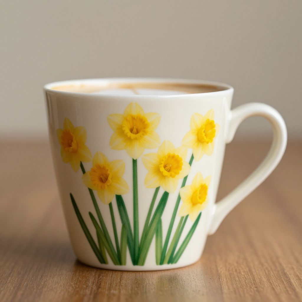 Elegant latte cup featuring a vibrant daffodil design with six yellow flowers and green stems, set against a creamy background, complemented by a smooth, curved handle.