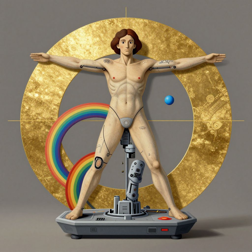 Vitruvian man dissolving into cybernetic transhumanistic bio mechanical game console, basil wolverton, high detail, studio ghibli, mc escher, picasso, dali, muted but vibrant colors, cubism, gold speckles, rainbow tubing, golden ratio, sparse symmetry
