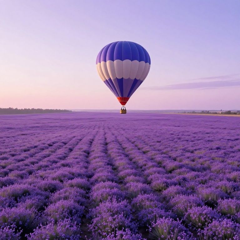 Photograph of a vibrant scene featuring a single blue and white striped hot air balloon with a red basket, soaring over a vast lavender field at sunset. The lavender plants, with their deep purple hue, create a textured, wave-like pattern stretching to the horizon. The sky transitions from soft pink near the horizon to a deeper blue at the top, with scattered clouds. The hot air balloon is centered in the image, casting a subtle shadow on the lavender below. The overall composition evokes a sense of serene beauty and tranquility.
