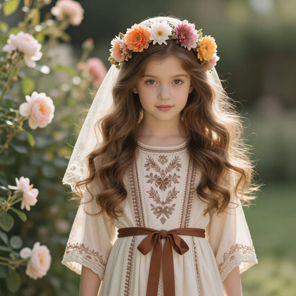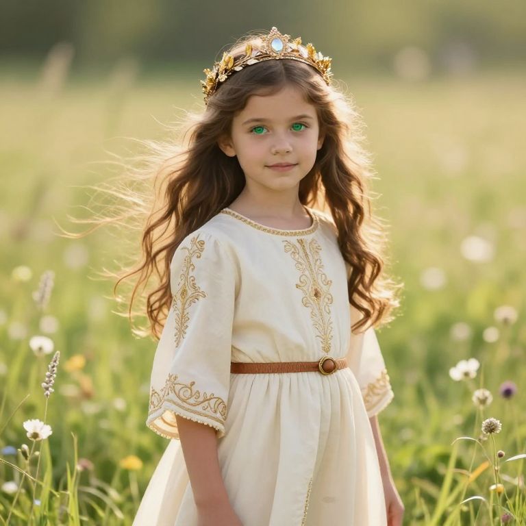 A young girl with soft, curly brown hair and bright, curious eyes stands in a sunlit garden, wearing a delicate gold dress that flows gracefully around her, adorned with intricate floral patterns. She wears a majestic headdress made of tiny golden feathers and beads, and complements the outfit with small golden jewelry—pearl necklaces, delicate bracelets, and a pendant shaped like a star. The scene is painted in warm, golden-hour light, with blooming roses and lavender in the background, creating a magical, enchanting atmosphere.