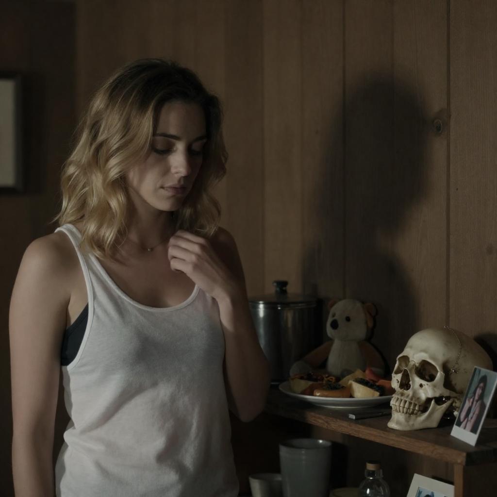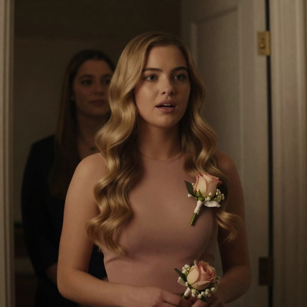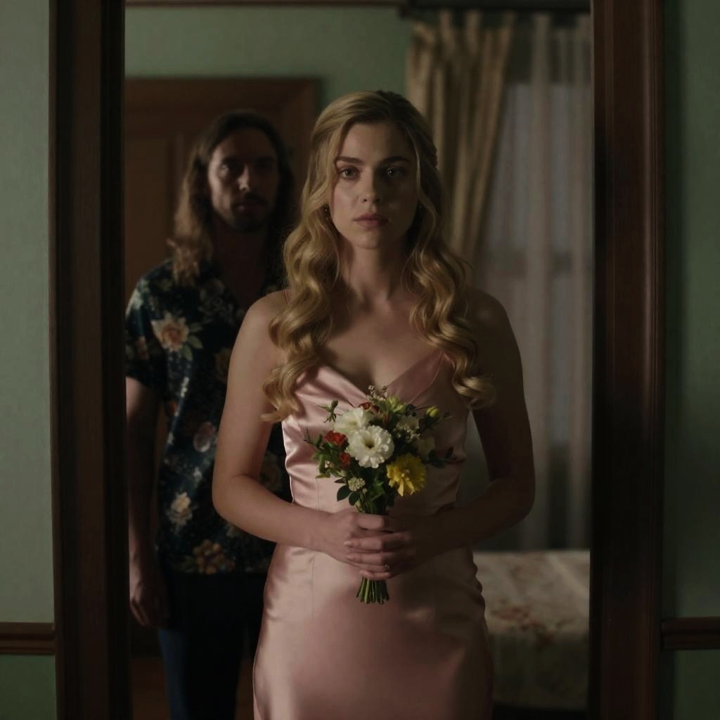 Photograph of a woman with long, wavy blonde hair, wearing a pink satin dress, holding a small bouquet, standing in a doorway, looking intently forward. A man with long brown hair, wearing a dark floral shirt, stands in the background, partially obscured, with a neutral expression. Dimly lit room with green walls, wooden door, and patterned curtain in the background.