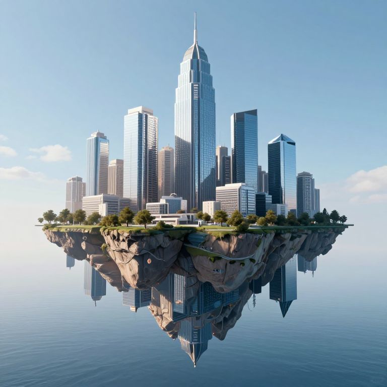 Photorealistic CGI of a floating cityscape featuring modern skyscrapers, including a tall, pointed spire, on a rocky island with reflective water