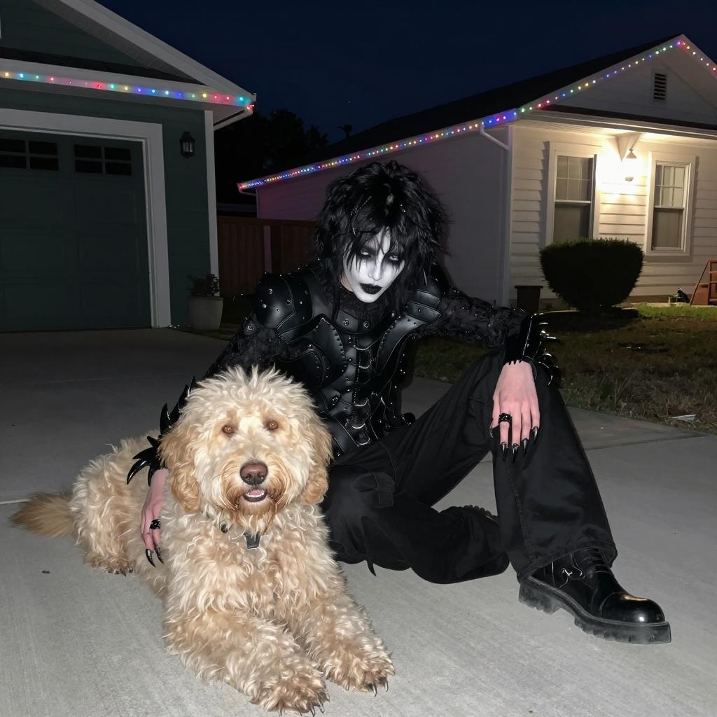 Nighttime photograph of a person in black, clawed costume sitting on a concrete driveway beside a fluffy, beige dog. Person has dark, wild hair, pale face, and sharp claws. Houses in background are decorated with colorful string lights. Green garage door on left, white house on right. Person's body is slouched, claws resting on the ground.