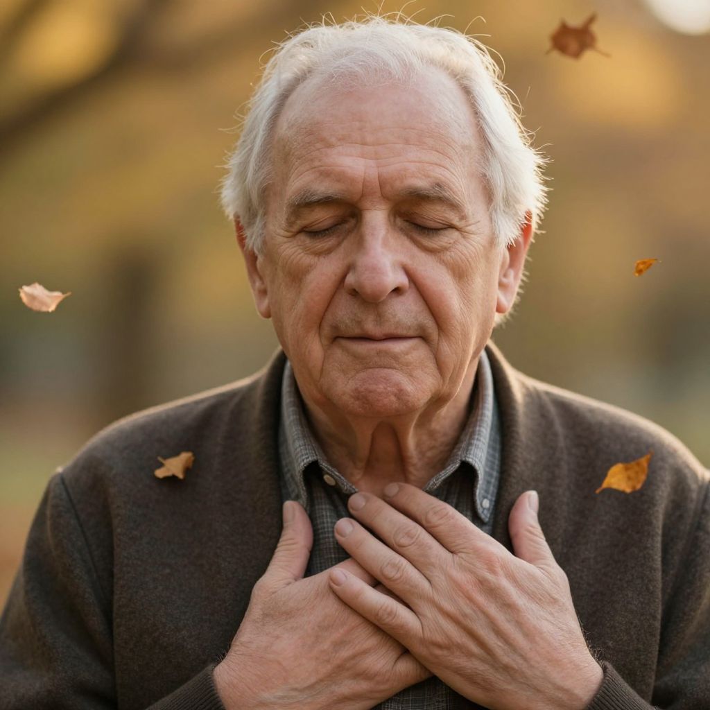 Relieved elderly man closing his eyes, hands softly touching his chest, surrounded by gentle autumn leaves falling, warm golden hour lighting, photorealistic style with emotional depth, close-up portrait