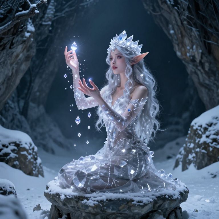 An ethereal crystal witch with high cheekbones and sharp, serene facial features sits on a moonlit stone pedestal, her hands raised as glowing gemstones cascade from her fingers like falling diamonds, casting a shimmering pattern of magic across a snowy mountain cave.