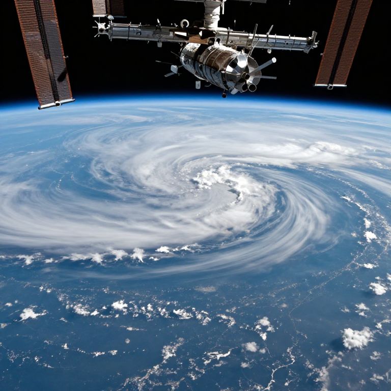 Photograph from space showing a large, white, swirling hurricane over a deep blue ocean. The hurricane's eye is centered, surrounded by spiraling clouds. Above, the edge of the Earth's atmosphere is visible, transitioning from blue to black. In the top center, a spacecraft with solar panels and antennae is partially visible, with two cylindrical structures on either side. The spacecraft has a metallic, industrial appearance, and the background is the vast, black expanse of space. The image captures the contrast between the Earth's vivid colors and the dark, empty space.