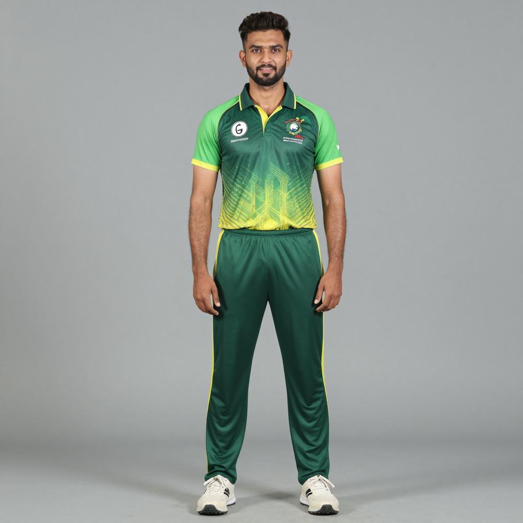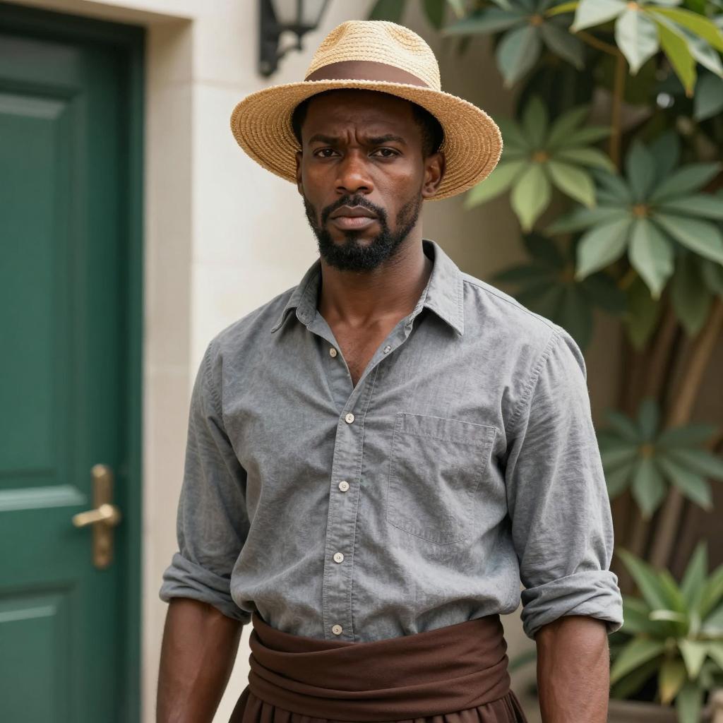 Cricket butterbean costume, photograph of black man wearing yellow polo shirt and black cricket helmet with netting, serious expression, standing against white brick wall, daytime, natural light, slightly blurred background, portrait view, realistic style