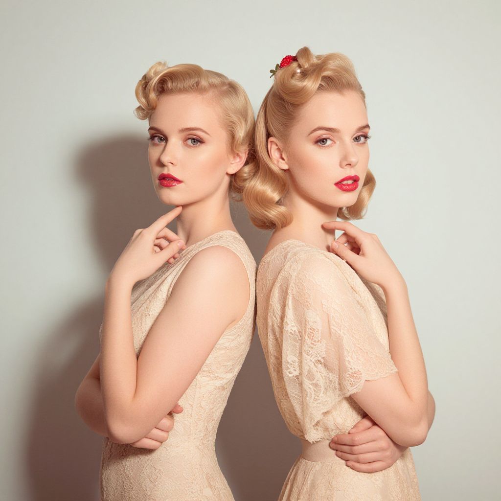 Photograph of two blonde women with fair skin, styled in vintage 1950s fashion. Both have short, wavy hair adorned with red flowers, and wear red lipstick. They are back-to-back, facing slightly to the right, with their right hands touching their chins. They wear sleeveless, lace, cream-colored dresses with delicate textures. The background is a plain, light blue wall, casting soft shadows. The lighting is bright, highlighting their smooth skin and retro makeup. The image has a glamorous, old Hollywood aesthetic.