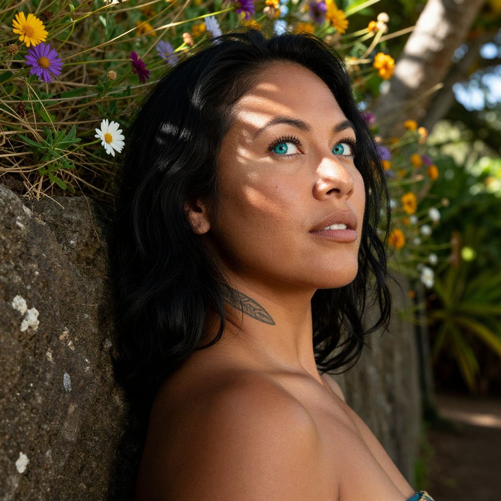 A photorealistic portrait captures an enigmatic Polynesian woman, aged 35, with captivating blue-green eyes and raven black hair falling in loose waves to her shoulders. Subtle tribal tattoos adorn her jawline. Shot from a low angle, she leans against an ancient stone wall adorned with vibrant wildflowers, her gaze fixed on the horizon. Warm sunlight filters through dense foliage above, casting dappled shadows across her face. Her expression shifts between introspection and playful curiosity. The image emphasizes natural skin texture, visible pores, and subtle blemishes, adding depth and character to this captivating scene.