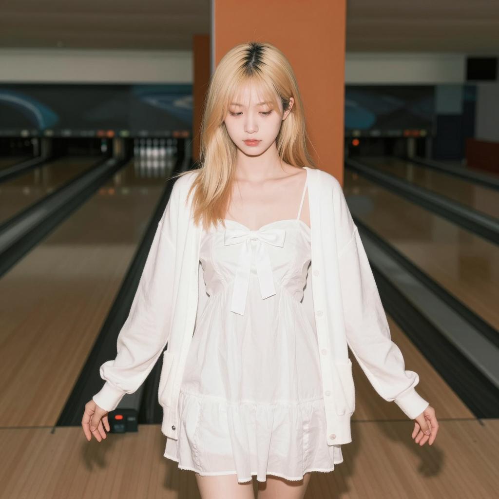 Young woman with pale skin and shoulder-length blonde hair. Wearing a white, strapless, loose-fitting dress with a bow at the chest and a white cardigan. Standing in an empty, dimly lit bowling alley. Two dark bowling lanes extend behind her. She looks down with a neutral expression, arms slightly out to the sides. One orange column is directly behind her.