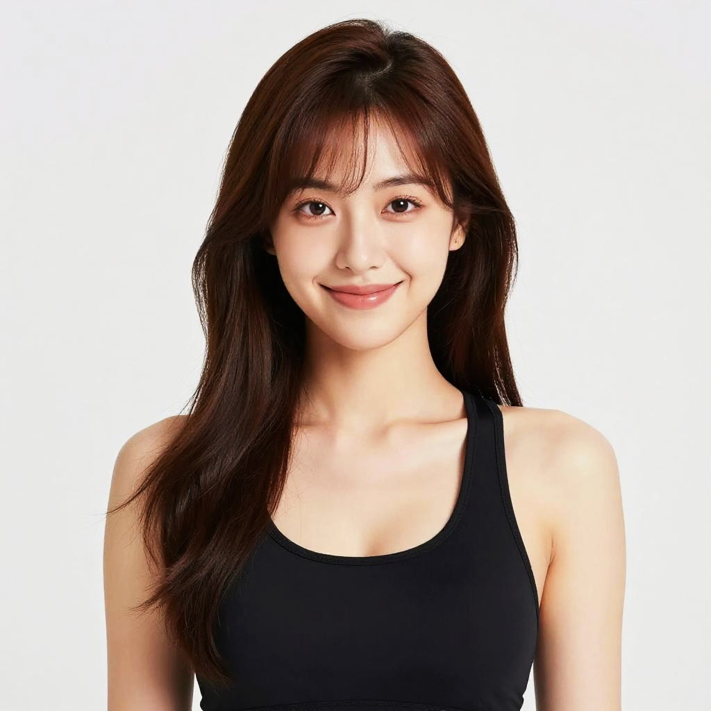 Best quality, photorealistic, 8k, high res, 1girl, woman, (skindentation), (portrait:0.6), gorgeous, ((whitebackground, sport bra, small brea BREAK 1.85)), (long brown hair, parted bangs:1.6), looking at viewer, (1girl eyes looking at viewer:1.6), (bokeh), (smile:1.3), pureerosface_v1:1, female portrait, long brown hair, parted bangs, direct eye contact, warm smile, soft bokeh background, detailed face, natural lighting, vibrant eyes