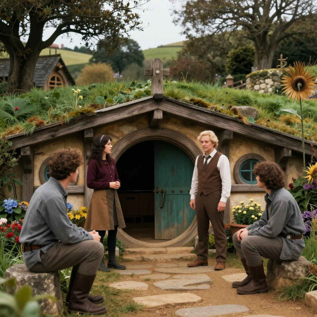 Photograph of two men standing in front of a charming hobbit house with a round, wooden door and small windows. The man on the left has brown hair, wears a gray long-sleeve shirt, black vest, and brown trousers. The man on the right has curly brown hair, a white long-sleeve shirt, and brown pants. The house is surrounded by vibrant flowers and lush greenery. In the background, there are additional hobbit houses and rolling hills with trees. The scene is set in a picturesque, idyllic countryside.
