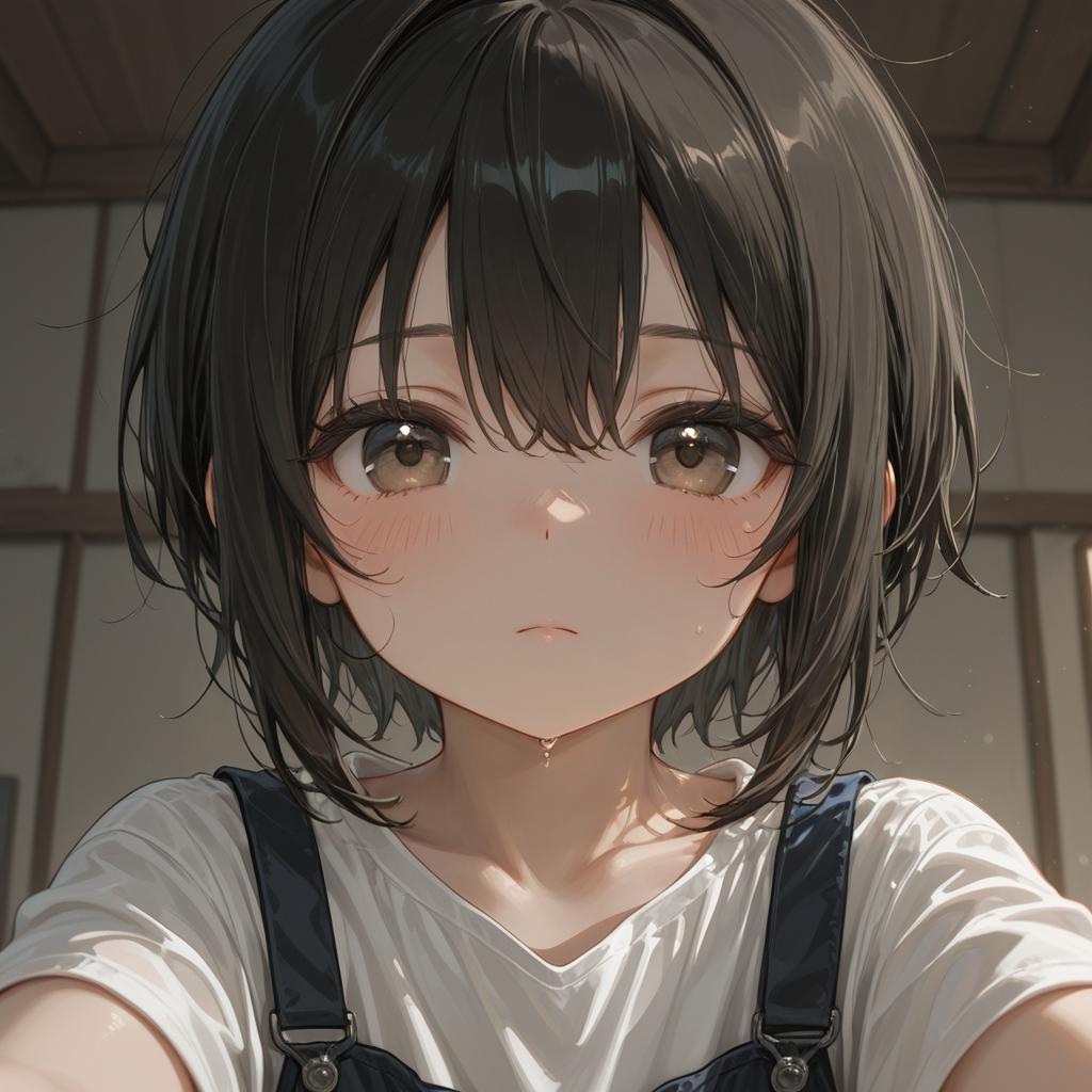 Close-up digital illustration of an anime-style young male character with short black hair and large brown eyes. The character is wearing a white shirt under black overalls, shown from the upper body, looking directly at the viewer with a neutral expression. The background features a softly lit indoor setting with wooden paneling.