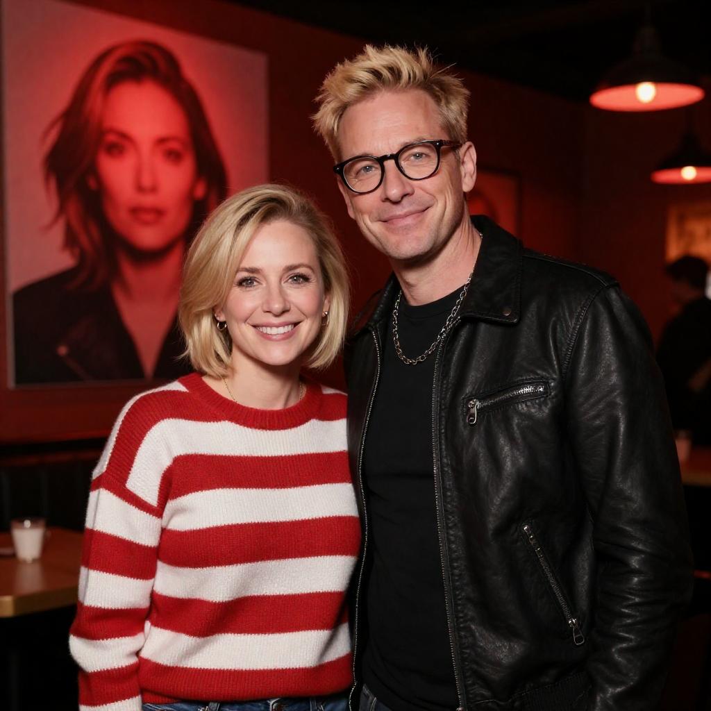 Photograph of a man and woman standing close together in a dimly lit room with red lighting. The woman, with short blonde hair, wears a striped red and white sweater, smiling. The man, with short blonde hair and glasses, wears a black leather jacket with a silver chain, also smiling. A large red-lit portrait of a woman is in the background.