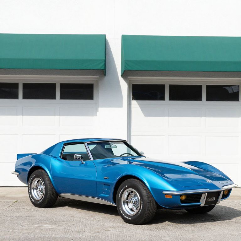Shiny blue 1970 Chevrolet Corvette parked in front of a white building with two garage doors and a green awning, showcasing its classic design and polished exterior.