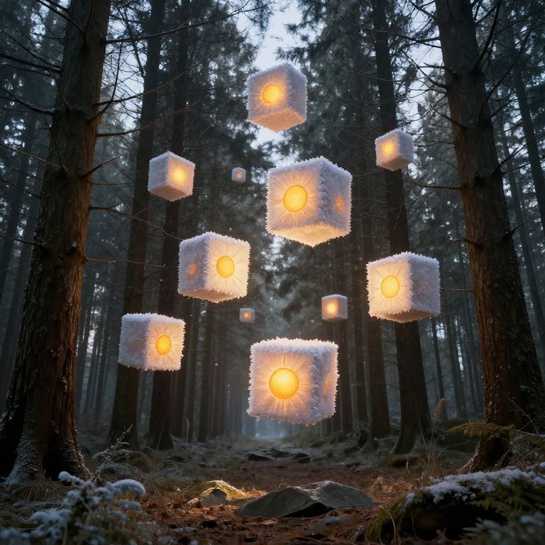 Forest trees bloom with floating cubes of frozen sunlight, each box bursting in midair at dawn to scatter miniature suns.
