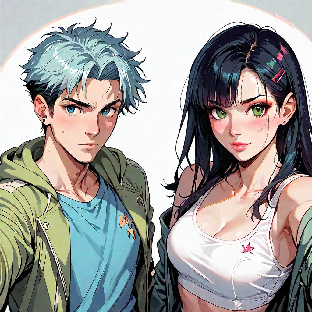 Selfie, group selfie, 2girls, 2boys, multiple girls, multiple boys, tendouakira, white shirt, green jacket, open jacket, andmikazukishizuka, hooded jacket, pink sports bra, andbeatrixamerhauser, white tank top, bare shoulders, andryuuzakikenichiro, blue shirt, open shirt, score_9, score_8_up, score_7_up, score_6_up, anime