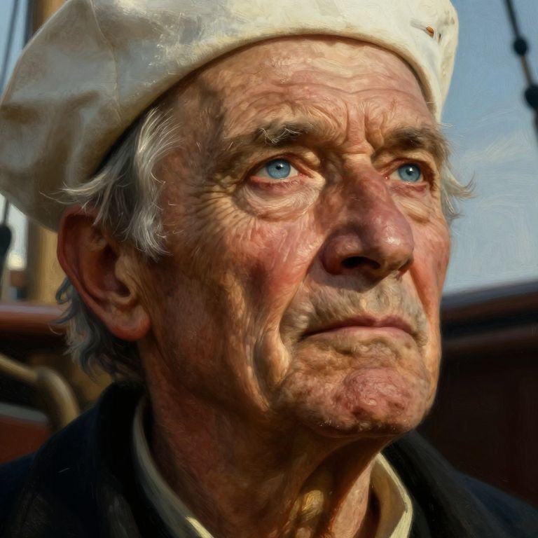 Craft a hyperrealistic portrait of an elderly sailor with piercing blue eyes and rugged features reminiscent of classic maritime oil paintings. Capture his intense gaze from a unique low-angle perspective, reflecting both wisdom and weariness as if viewed from below deck. Let the soft golden light cast dramatic shadows across his lined face, creating a striking chiaroscuro effect that evokes a deep emotional gradient of introspection and resilience. This portrait invites viewers to delve into the depths of his storied life at sea.