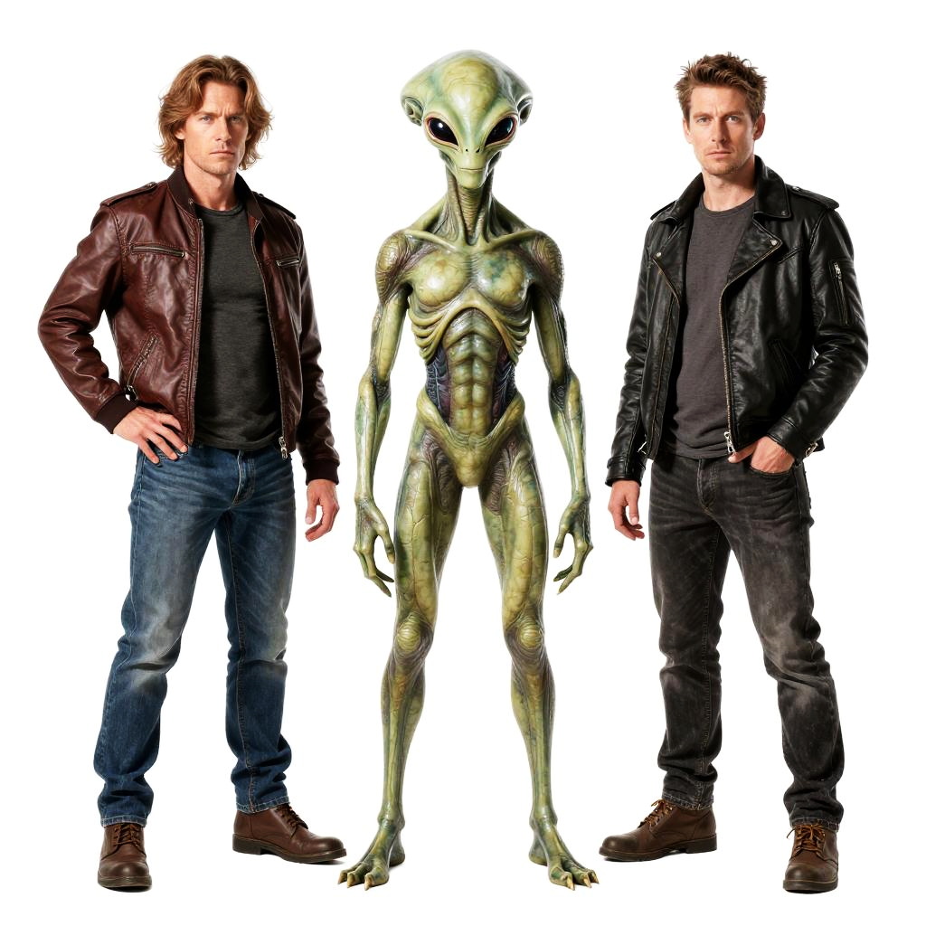Two men dressed in casual outfits, one wearing a brown leather jacket with jeans and brown boots, the other in a black leather jacket with dark jeans and brown boots, standing on either side of a realistic full-body alien figure with greenish skin and large black eyes. The scene is set against a white background, showcasing the contrast between humans and an extraterrestrial being.