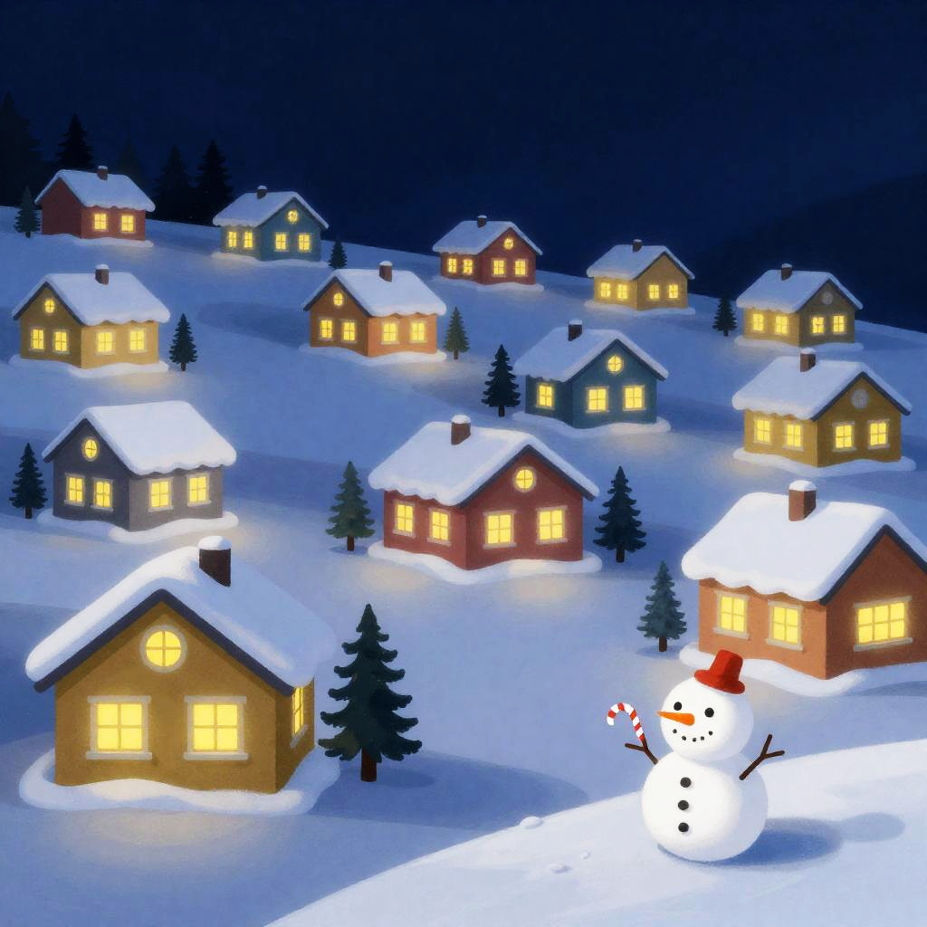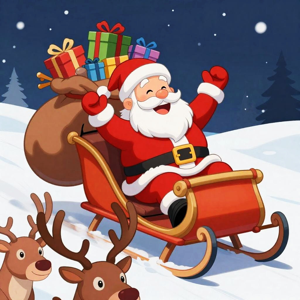 Nighttime illustration. Santa Claus in black suit with reindeer in sky, pulling a sleigh with a smiling moon face. Snowy village below with snow-covered roofs and chimneys. Snowflakes falling, bright blue sky. Santa's face not visible. Reindeer silhouette, moon with expressive eyes.