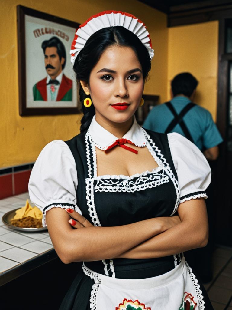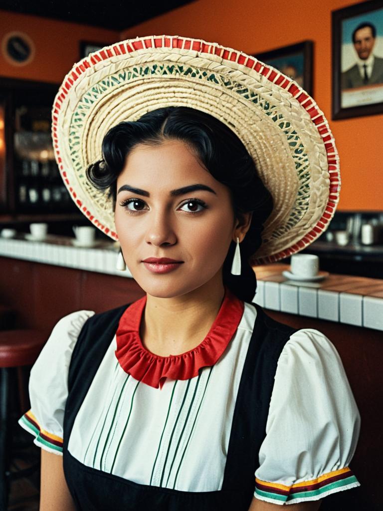 Woman in Mexican Waitress Costume, photorealistic vintage cosplay portrait, cinematic realism