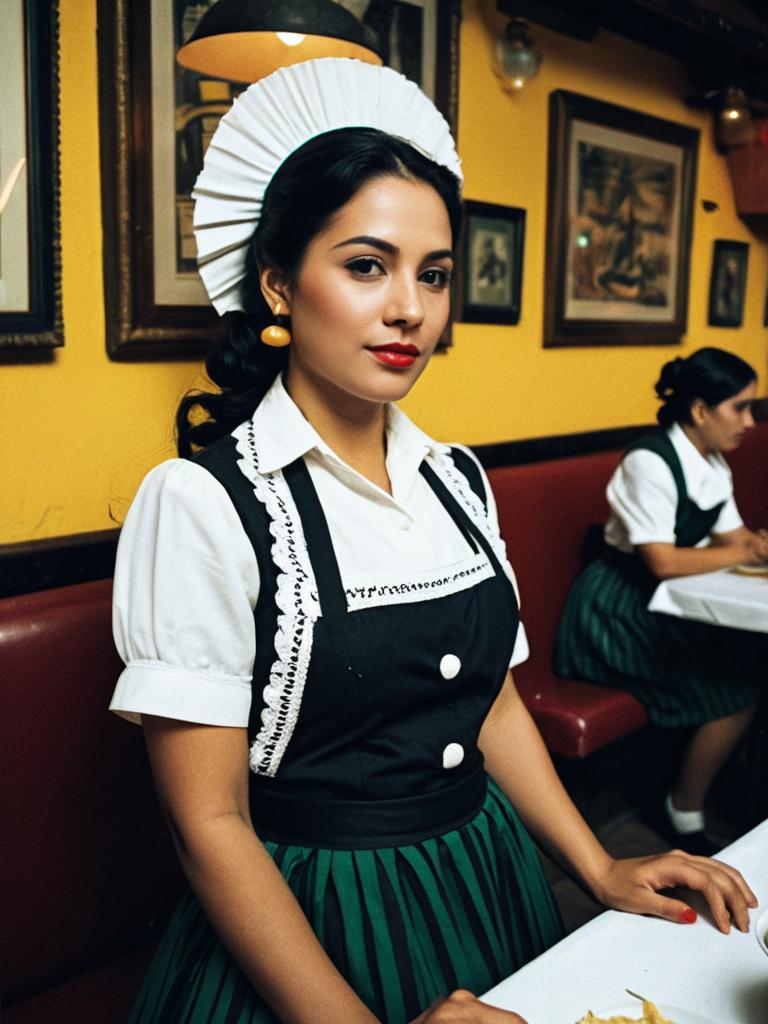Photorealistic portrait of a young woman dressed in a traditional Mexican waitress costume featuring a black dress with white lace details, a white apron, puffed sleeves, a red bow tie, and a white pleated headpiece. The setting appears to be a vintage Mexican restaurant with warm lighting and rustic decor.