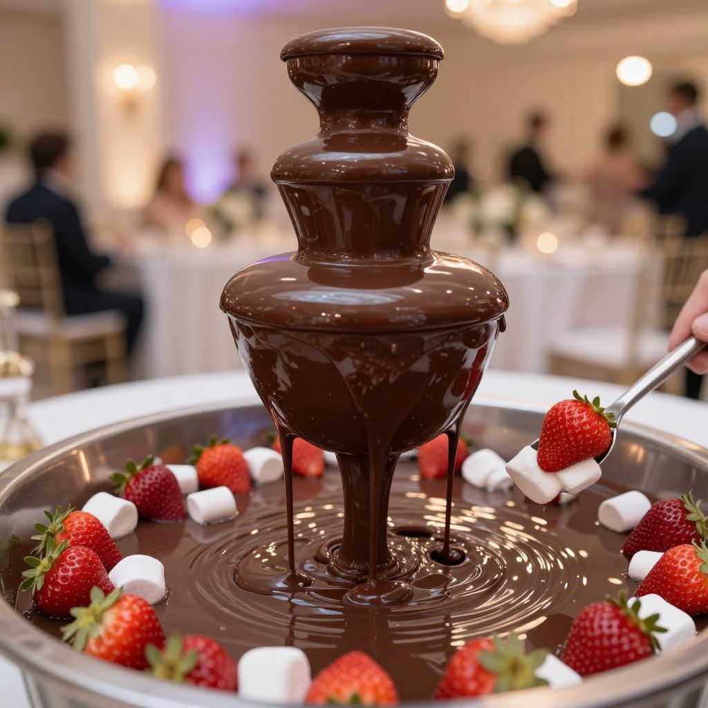 Cioccolato fountain flowing smoothly in a luxurious setting, with fresh strawberries and marshmallows being dipped, soft glowing ambient lights, elegant party atmosphere, crystal clear water reflections, hyper-realistic rich textures and vibrant colors