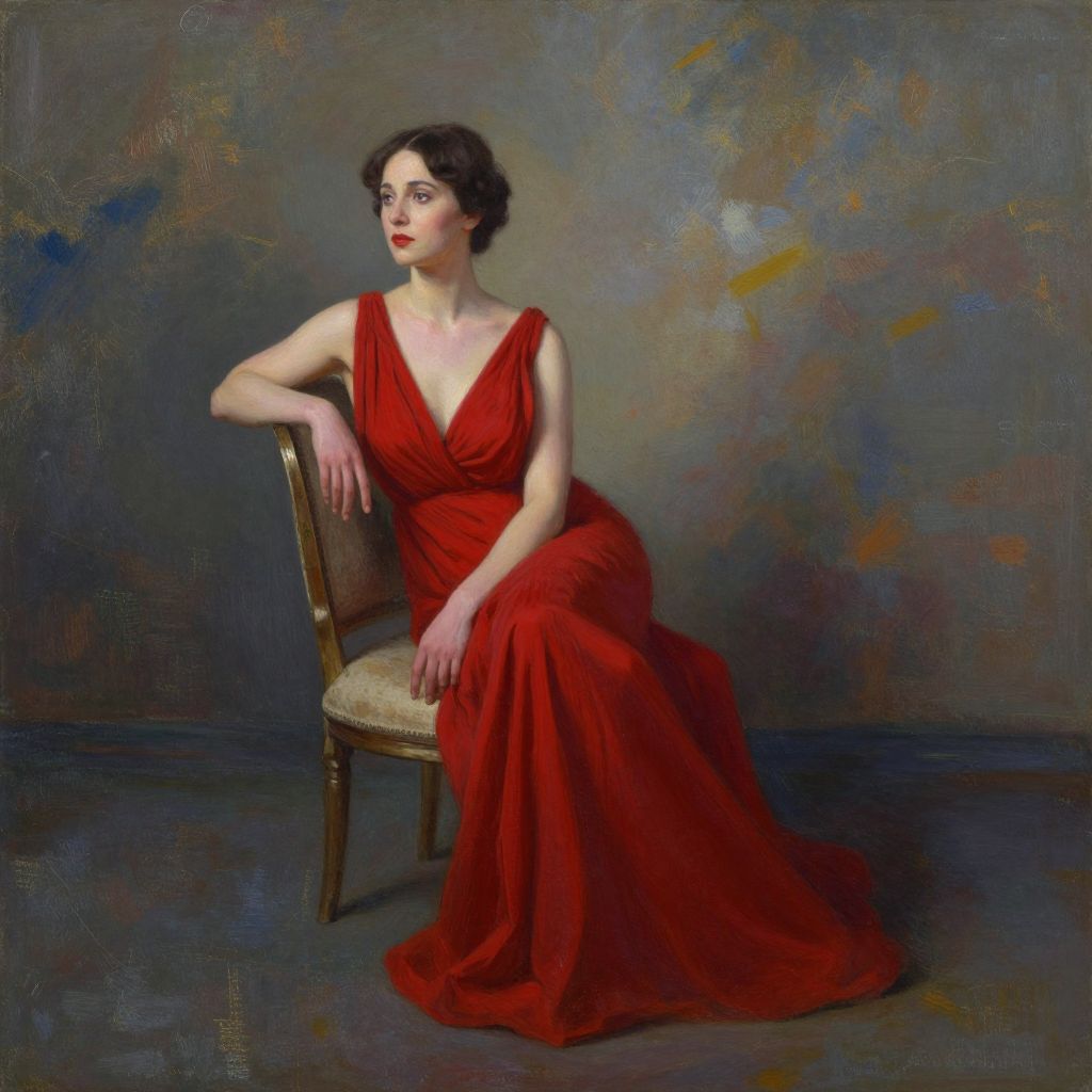 A woman in a striking red gown sits elegantly on a vintage-style chair, her pose exuding grace against a textured, impressionistic backdrop reminiscent of Andrew Atroshenko's hand-painted style, blending classical elegance with modern artistic flair.