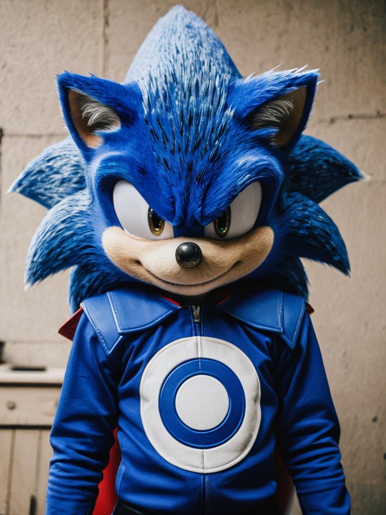 Man in Sonic the Hedgehog Costume, waist-up editorial portrait with sharp detail