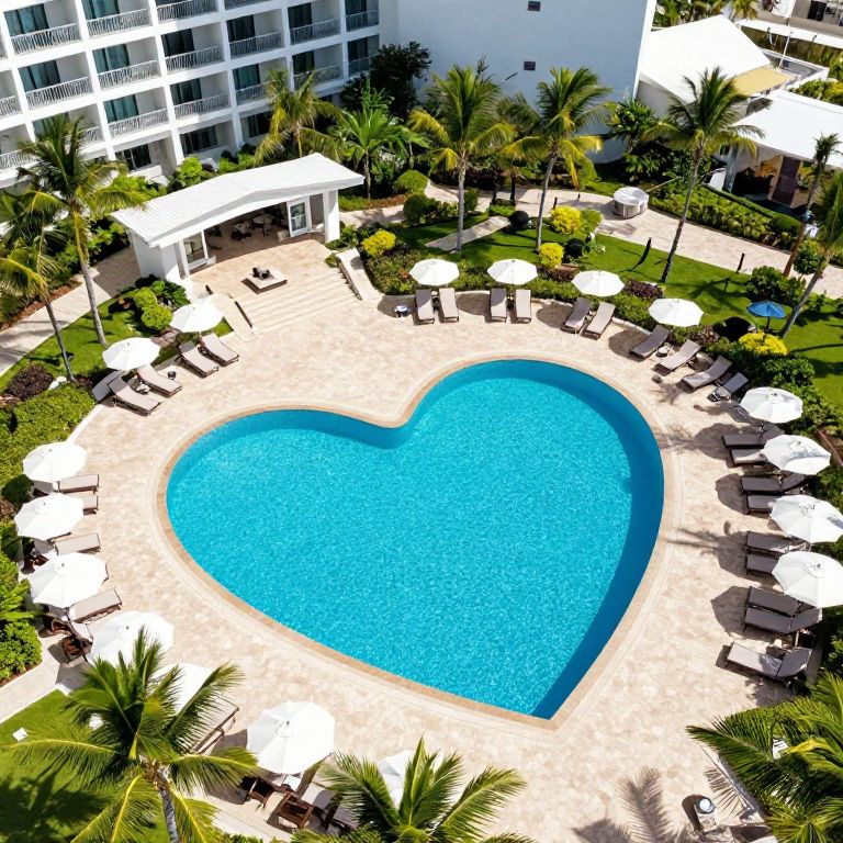 Aerial photo of a heart-shaped pool surrounded by white sun umbrellas, lounge chairs, and palm trees in a sunny, tropical resort. White apartment
