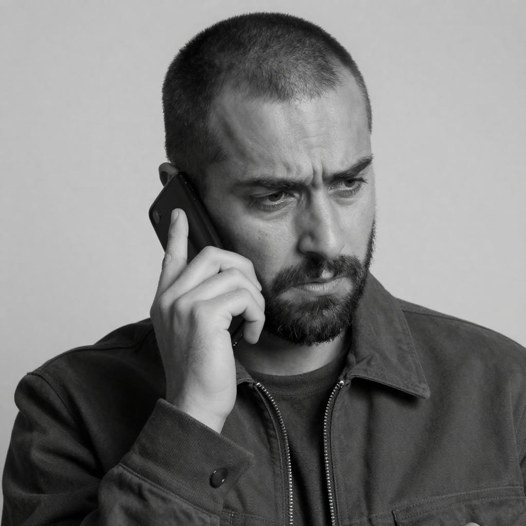 Photograph of a bearded man with short brown hair, wearing a dark purple sweatshirt, leaning on a balcony railing. He holds a phone to his right ear. Urban cityscape with buildings and distant hills in the background. Overcast sky. Man looks focused.