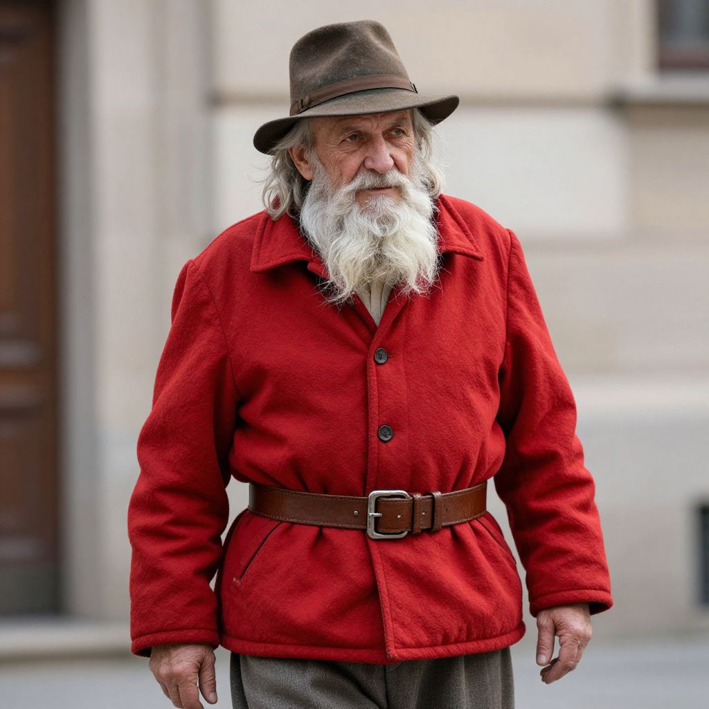 A distinguished old man with a flowing white beard and a weathered brown hat, exuding a wise and gentle aura, is depicted wearing a vibrant red coat cinched with a brown belt over comfortable gray pants.