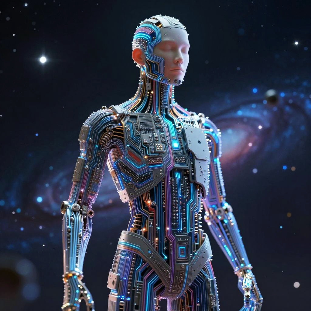 AI inspired art showcasing a surreal humanoid figure composed of circuit boards and flowing data streams, set against a cosmic background filled with stars and glowing particles, capturing the fusion of human and machine creativity.