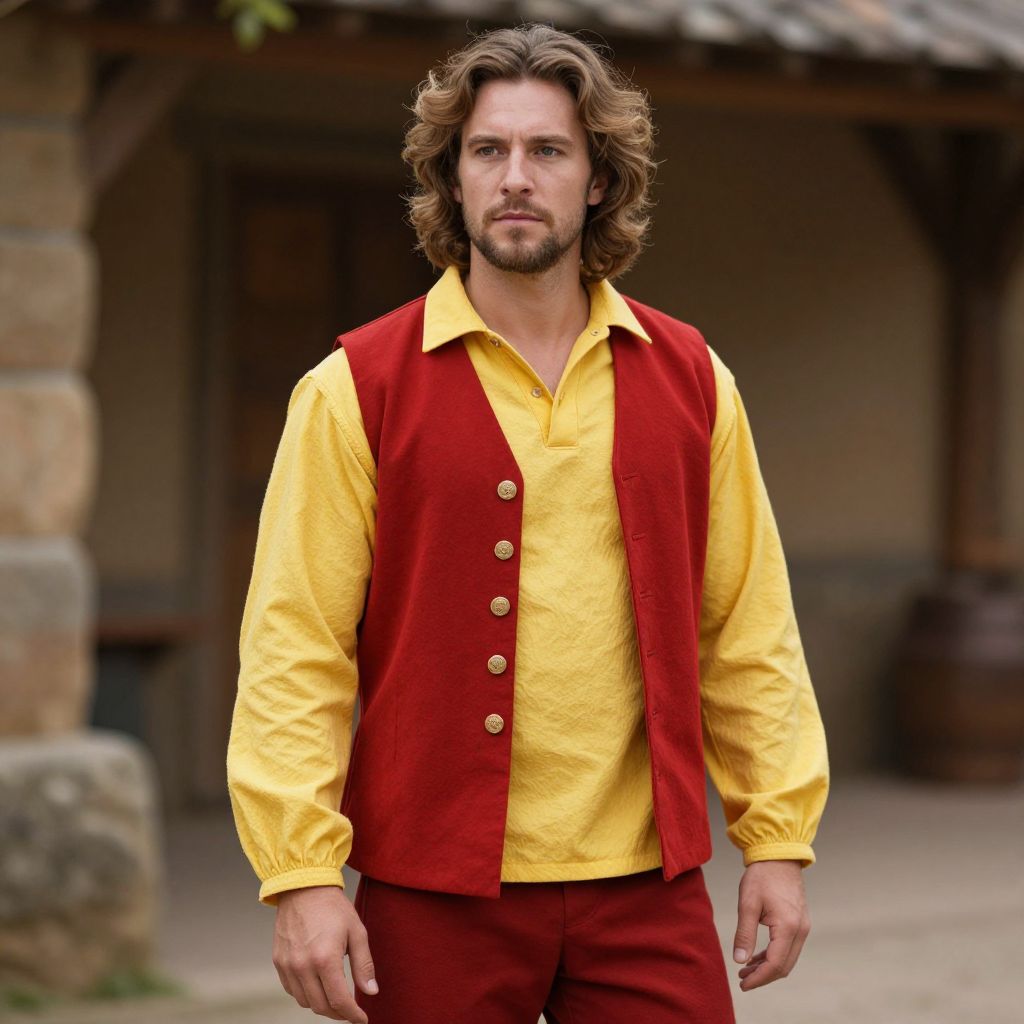 Photograph of a Caucasian man with wavy, shoulder-length brown hair and a trimmed beard, standing outdoors in front of a rustic building with a tiled roof. He wears a bright yellow shirt with a red vest adorned with four gold buttons, and matching red pants. His expression is serious and focused. The background is slightly blurred, featuring stone walls and wooden elements, adding to the rustic aesthetic. The lighting is natural, highlighting the vivid colors of his outfit.