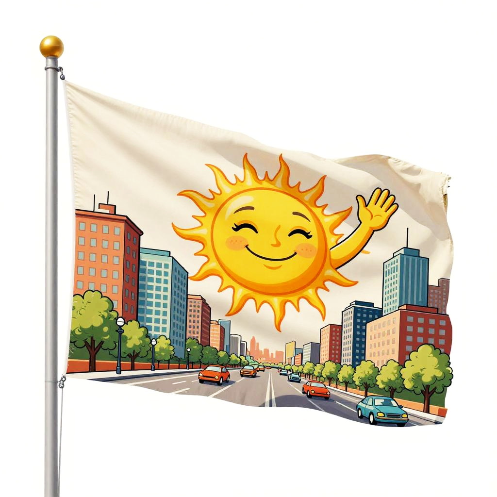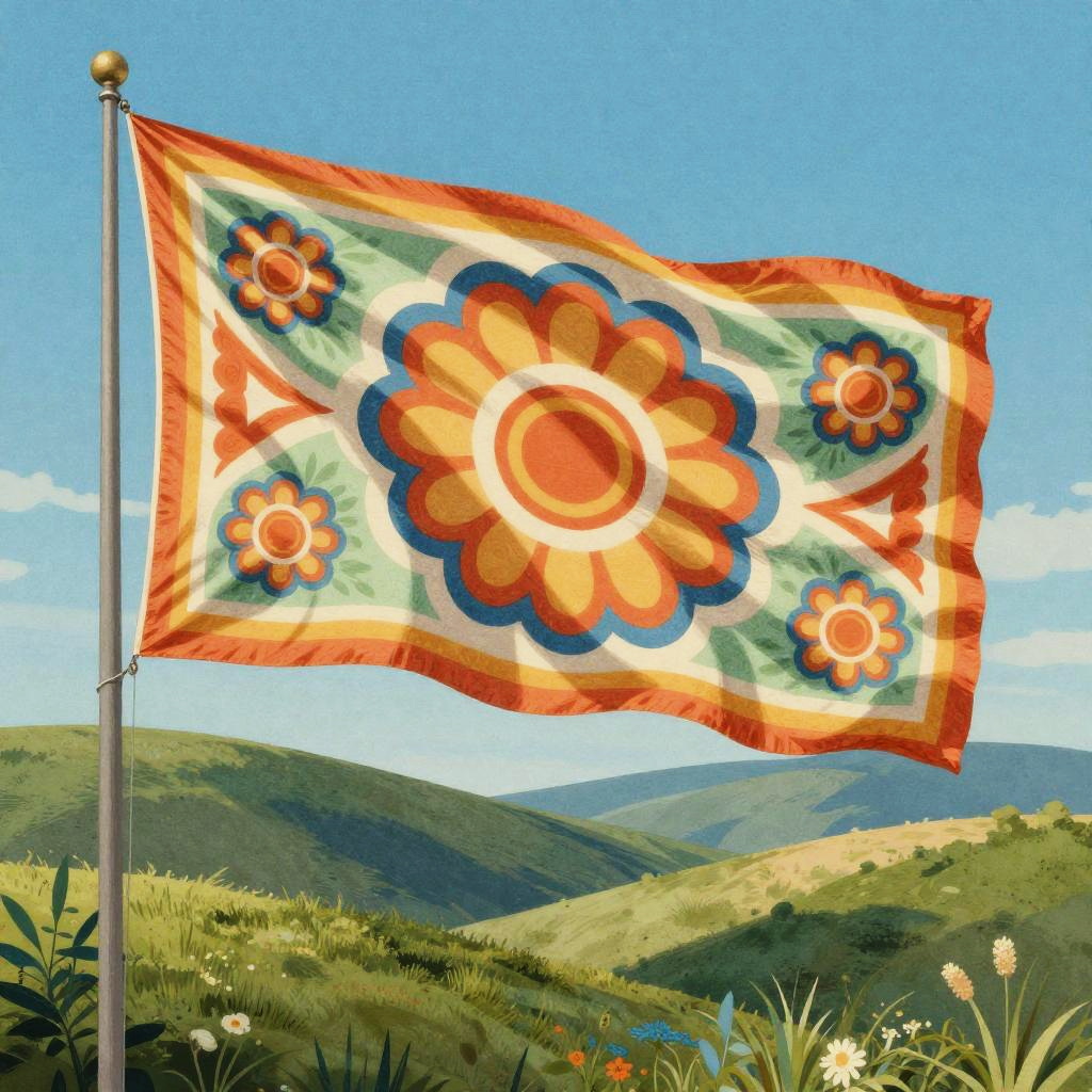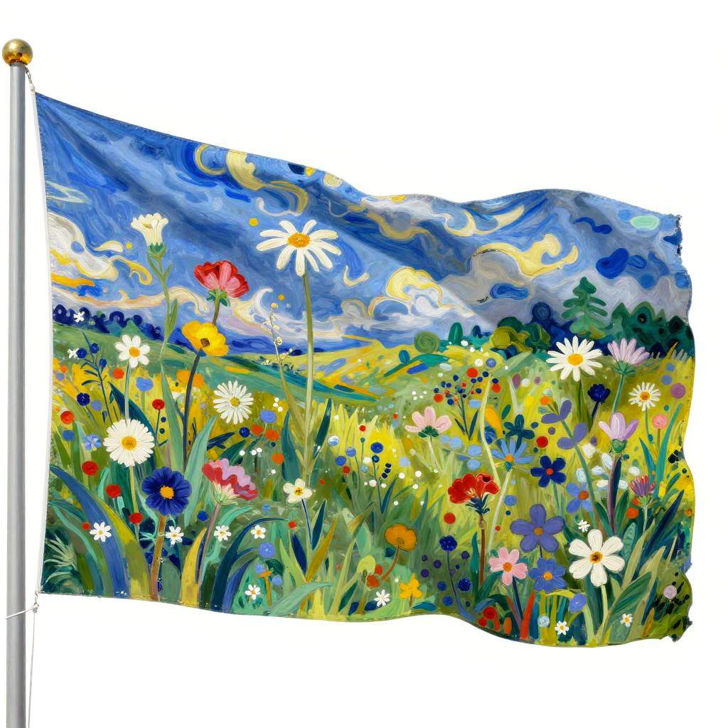 Illustration of a flag with fauvism style from early 20th century featuring wildflowers waving in a bright summer meadow