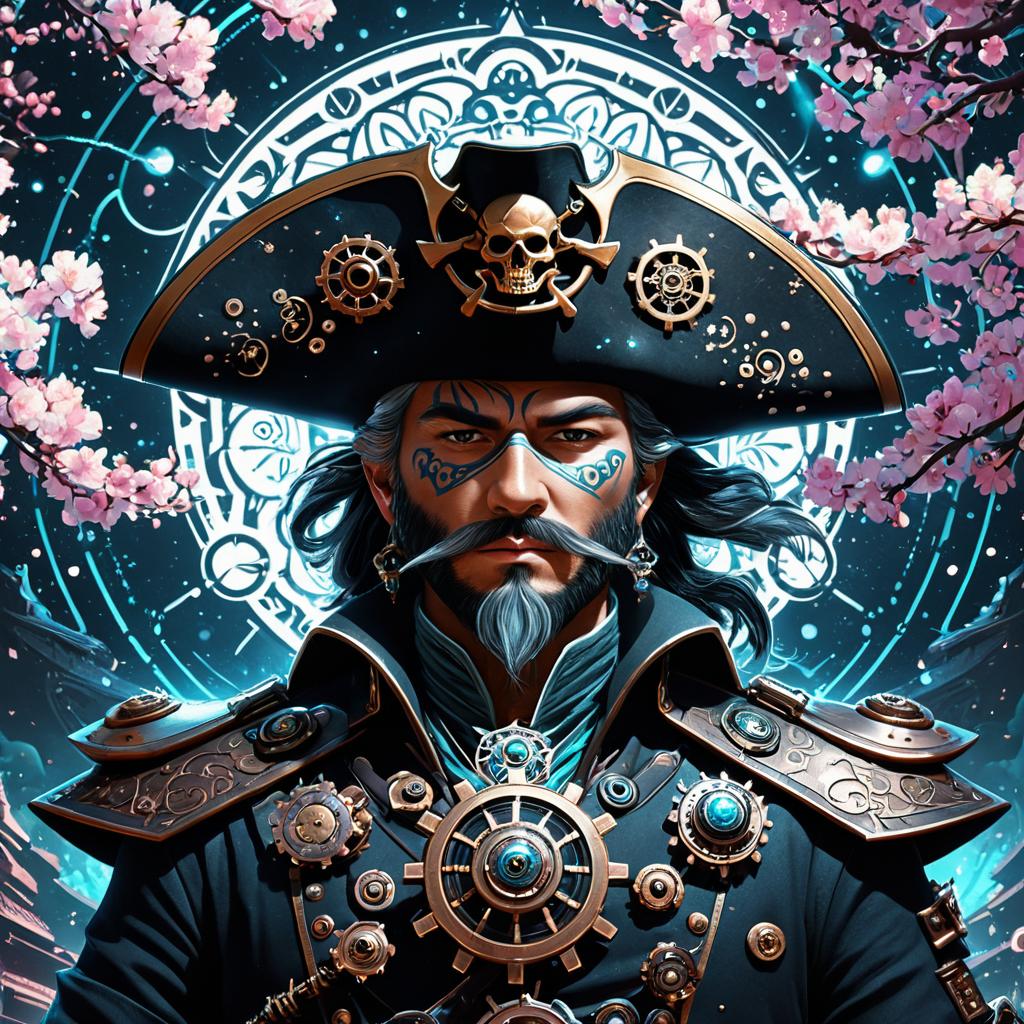 A hyperrealistic digital portrait of a space pirate wearing a decorated tricorn hat with metal gears and a skull emblem. The pirate features intricate facial tattoos, a styled beard and mustache, and elaborate armor adorned with mechanical gears and glowing blue orbs. The background showcases glowing mandalas, swirling bioluminescent energy, 3D fractals, and delicate cherry blossom branches, rendered in 8k resolution with a futuristic and fantasy theme.