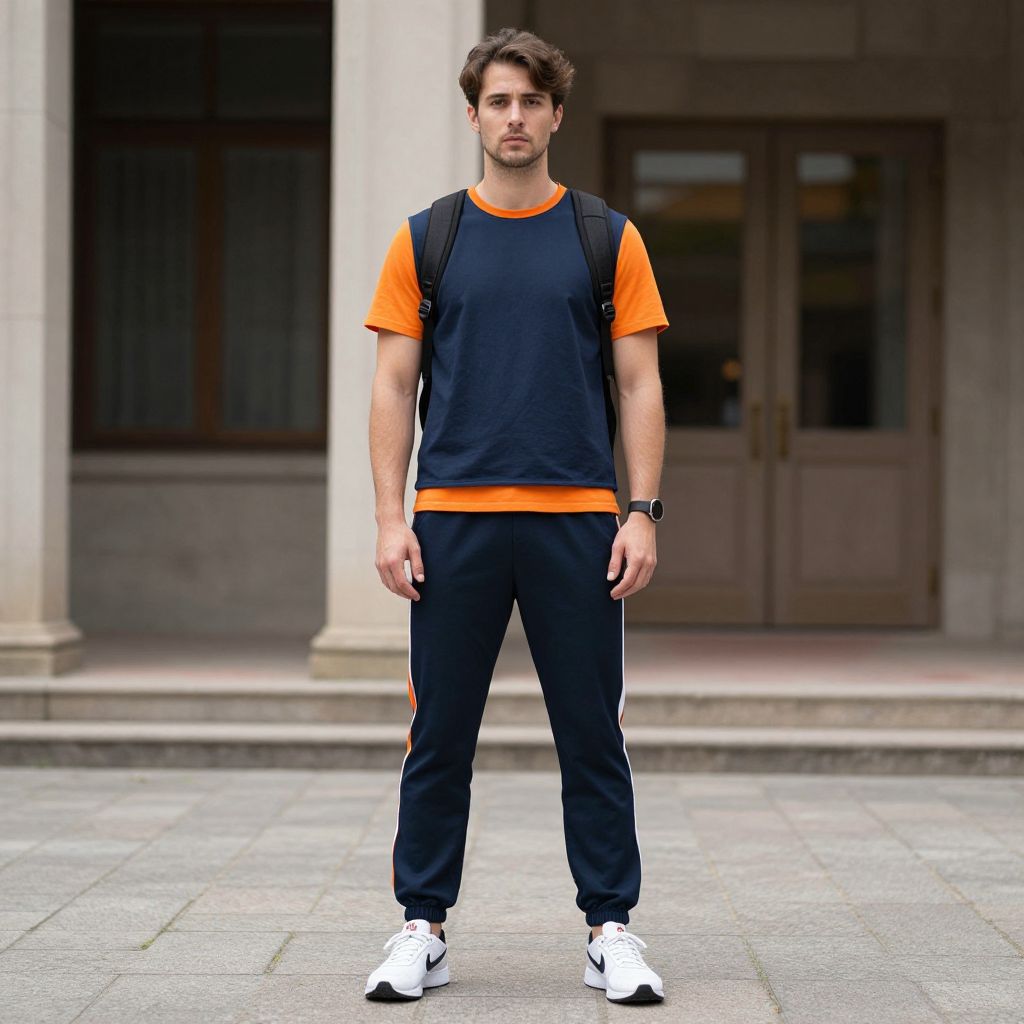 Photograph of a young, Caucasian man with short brown hair and a trimmed beard standing outdoors on a paved stone surface. He wears a black athletic shirt with bright orange sleeves, black track pants with orange side stripes, and white sneakers. He carries a black backpack and has a black watch on his left wrist. The background features a stone building with large, dark wooden double doors and tall columns. The man's expression is neutral, and he stands with his arms relaxed by his sides. The lighting is natural, suggesting daytime.