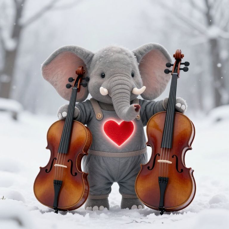 Playful elephant stands in a snowy landscape, holding a wooden cello while wearing a jumpsuit adorned with a glowing red heart, evoking warmth amidst the icy surroundings.