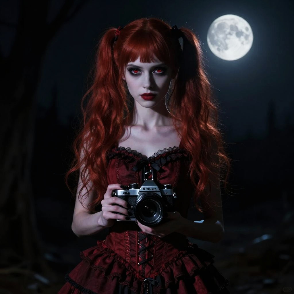A gothic-style woman with long red twin-tailed hair and pale skin, holding a vintage film camera. She is dressed in a dark red corset dress with black lace frills and a ruffled skirt. Her piercing red eyes and dramatic makeup stand out against the night sky illuminated by a bright full moon. The detailed texture and rich colors create a hyper-realistic atmosphere with strong moonlight and deep shadows.