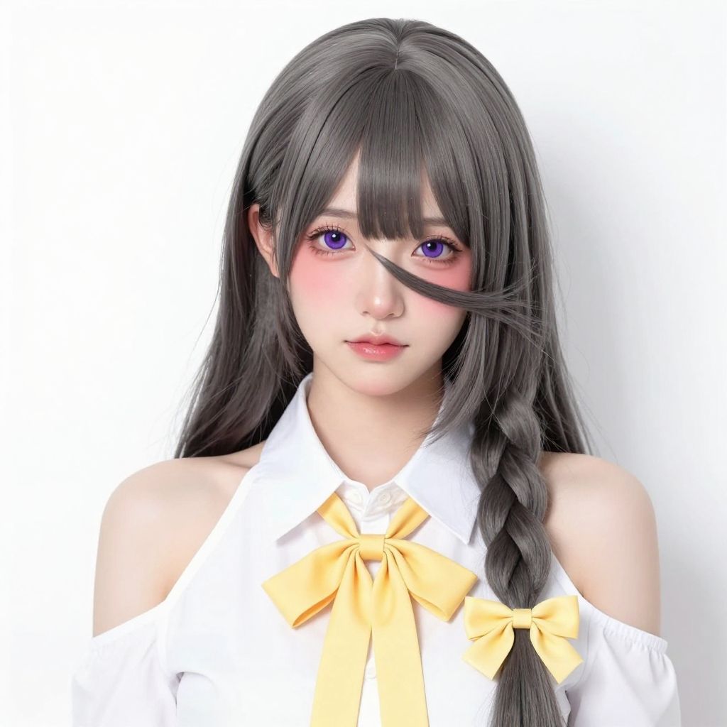 Digital anime-style portrait of a young woman with long, silver-braided hair, purple bows, and a white, off-shoulder blouse with