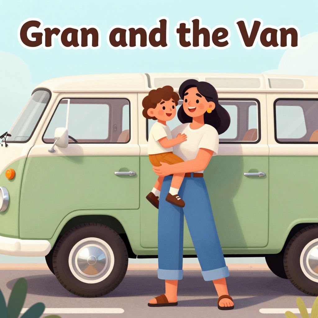 A vibrant digital illustration titled \"Gran and the Van\" by Fran Caldwell depicts a cheerful scene featuring a woman holding a child, standing beside a retro-style green and cream van, rendered with smooth gradients and detailed textures characteristic of high-definition digital art.