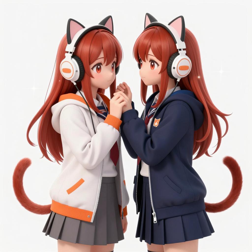 Digital artwork of two anime-style cat girls with red hair, each wearing cat ear headphones and school-style outfits. One girl wears a white jacket with orange accents and a grey pleated skirt, while the other wears a dark blue jacket with a matching skirt. Both have cat tails and are connected by headphone cables, with one girl gently holding the other's face in a tender pose, set against a softly lit background with sparkles.