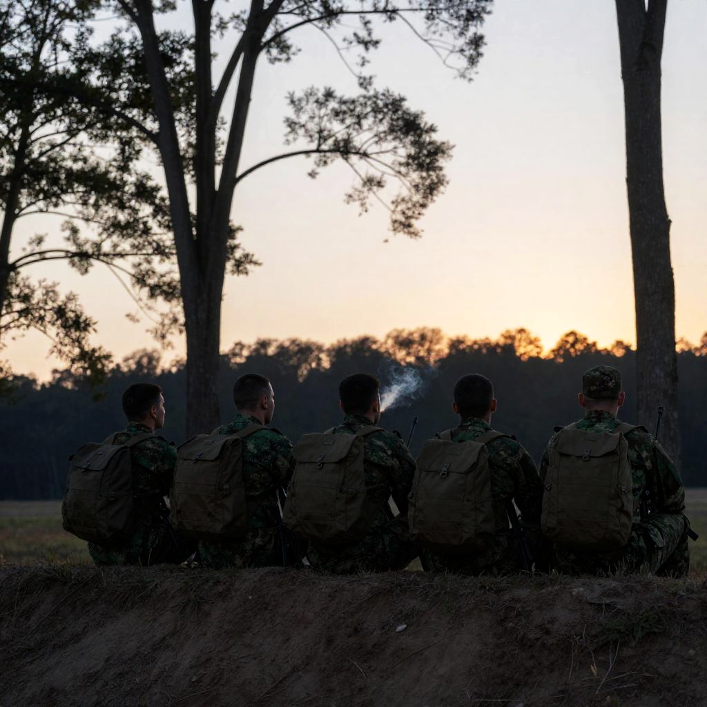 Photograph of three men in a forest clearing. Two men in military uniforms carry backpacks, running with the third man in civilian clothes aiming a rifle. Dense trees in background, dry grass, and a fallen log on the left. Sunlight filtering through trees. The man with the rifle has a focused expression.