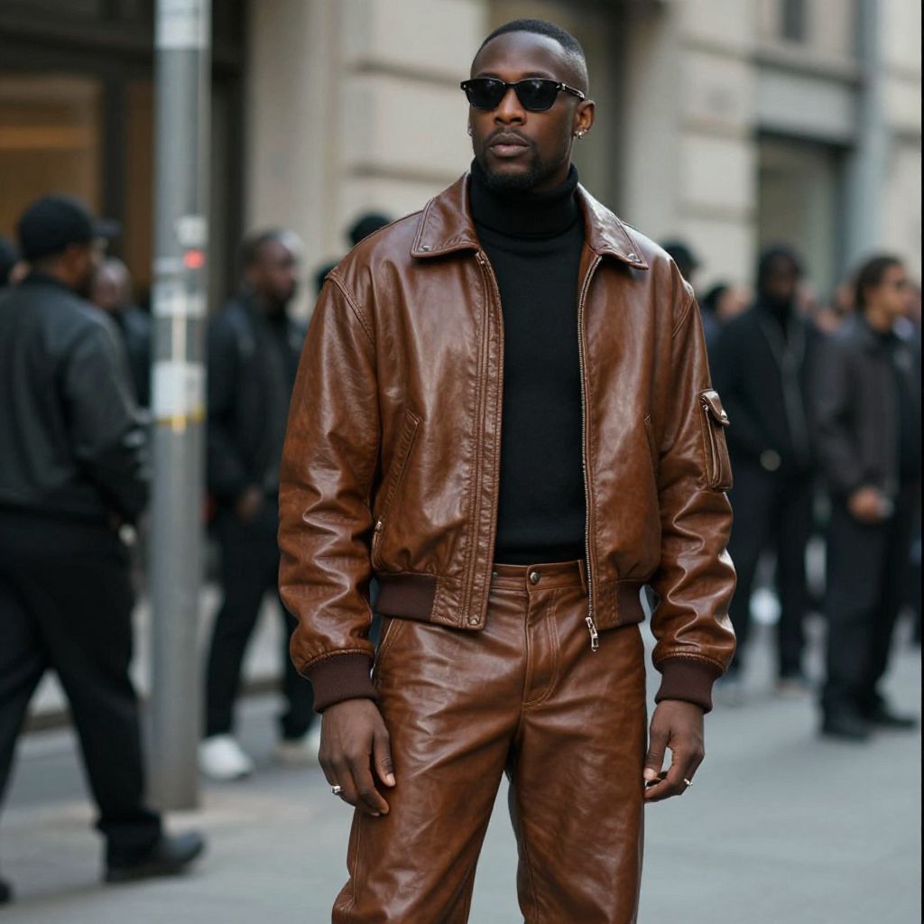Photograph of a tall, black man in brown leather jacket and pants, black turtleneck, sunglasses, standing confidently on urban street. Blurred