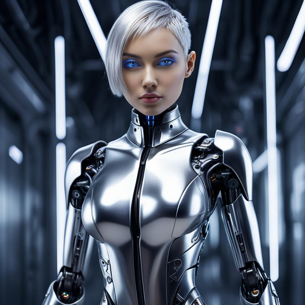 (12k, highest quality, ultra-detailed futuristic portrait photography, slender futuristic cyborg model in a sleek metallic environment, wearing a form-fitting silver bodysuit, intricate tech accessories (sleek robotic limbs, glowing circuitry:1.5) piercing cybernetic eyes, sculpted cheekbones, enigmatic smile, short silver hair, shimmering chrome skin, athletic build, defined contours, elongated limbs, sharp focus, ambient neon light:1.4)