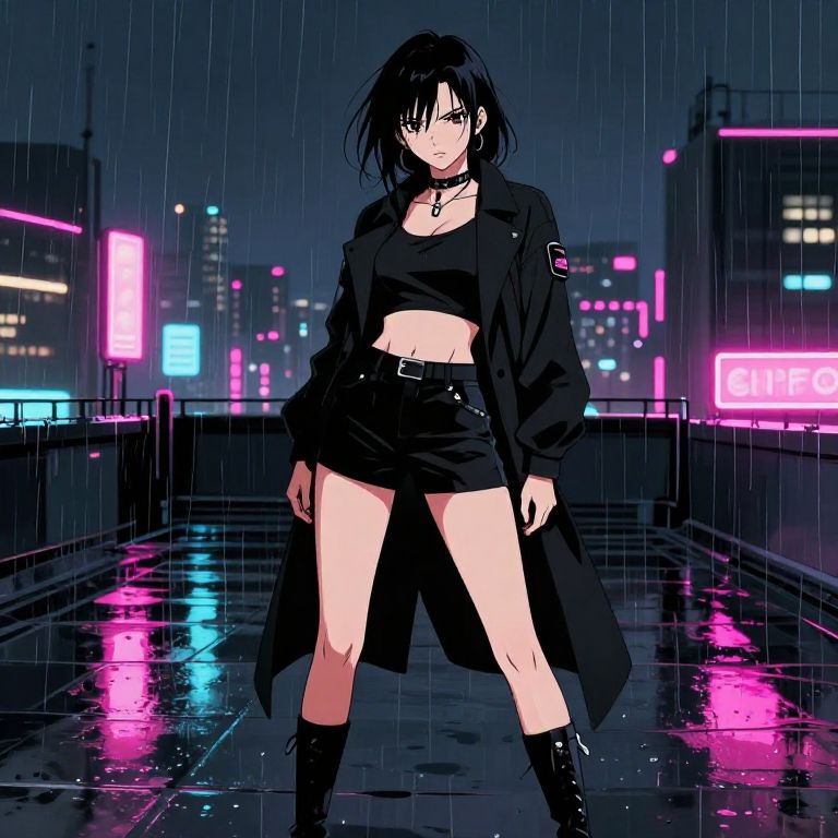 Anime girl in a daring outfit, standing confidently on a rainy urban rooftop, neon signs reflecting off wet surfaces, intense gaze, stylized art with sharp lines and contrasts, mysterious and bold atmosphere
